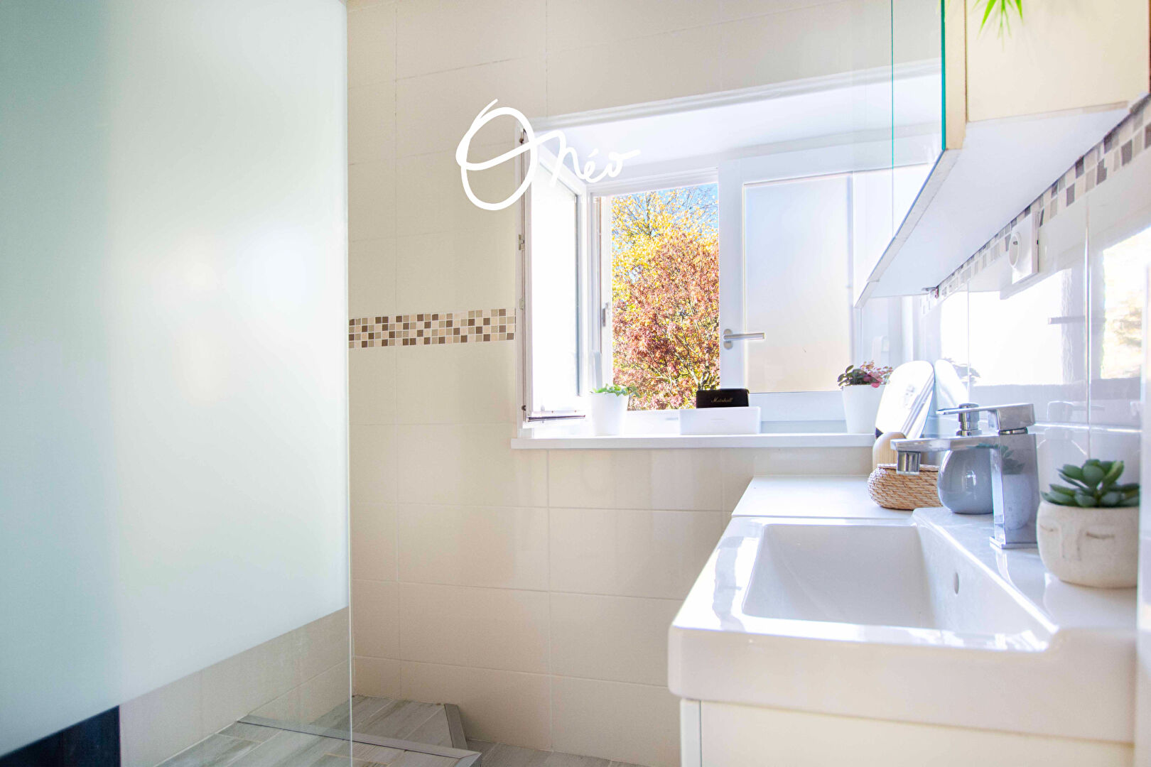 À l’étage, un grand dégagement offre un espace buanderie, une chambre climatisée et un bureau/Dressing.