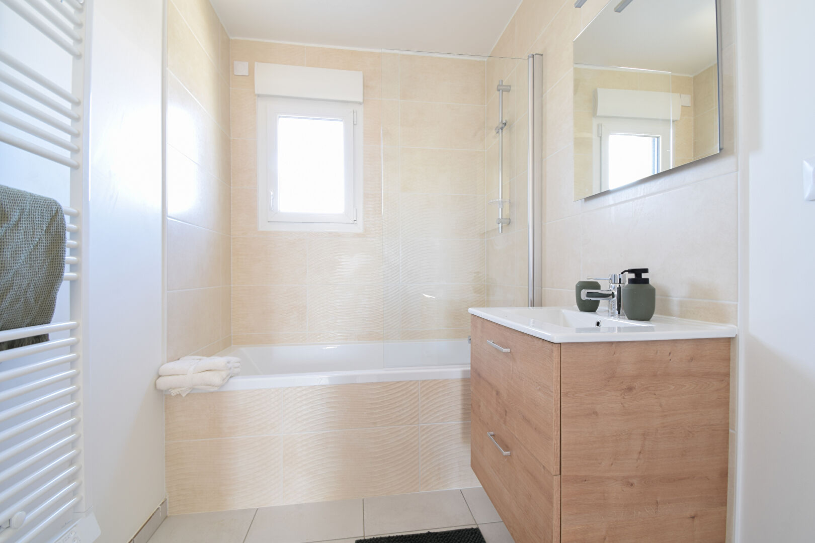A l’étage, vous profiterez d’une agréable salle de bains avec baignoire, meuble vasque, de 3 belles chambres (de 11,84 m2, 12,29 et 12,97 m2), 2 orientées à l’ouest et une à l’est, d’un espace ouvert idéal pour aménager un bureau ainsi que d’un second WC séparé.