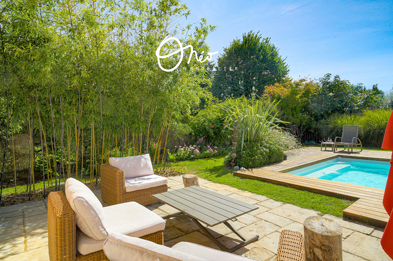– la très belle terrasse surplombant la piscine chauffée et son jardin