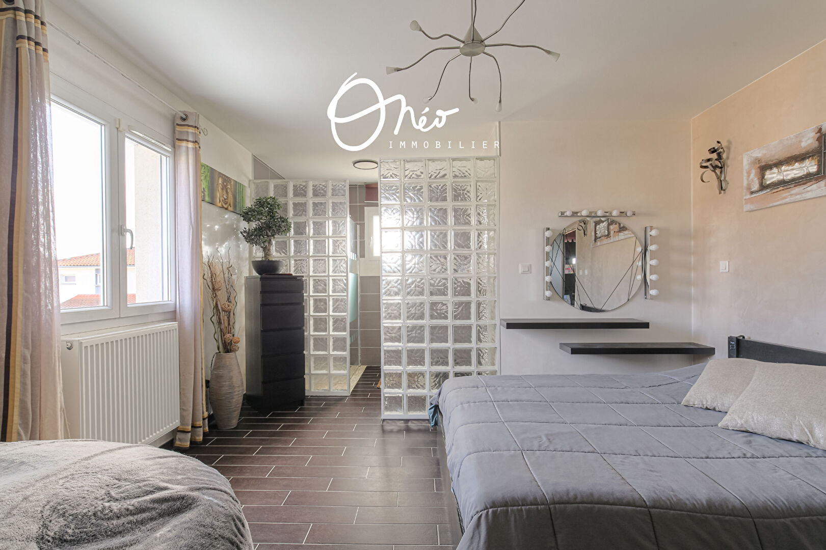 A l’étage, le volume parents s’impose et présente une suite parentale de 26 m2 avec sa salle d’eau ouverte et son superbe dressing tout équipé. Cet espace dispose également de second WC indépendant et d’un dégagement ouvert sur le séjour permettant d’installer au besoin un espace de travail.
